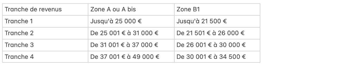 Après avoir calculé le revenu fiscal de référence du ménage et l'avoir divisé par un coefficient familial, on obtient un revenu ramené à l'équivalent d'une seule personne. Ce revenu permet de situer le ménage dans l'une des quatre tranches de revenus suivantes :